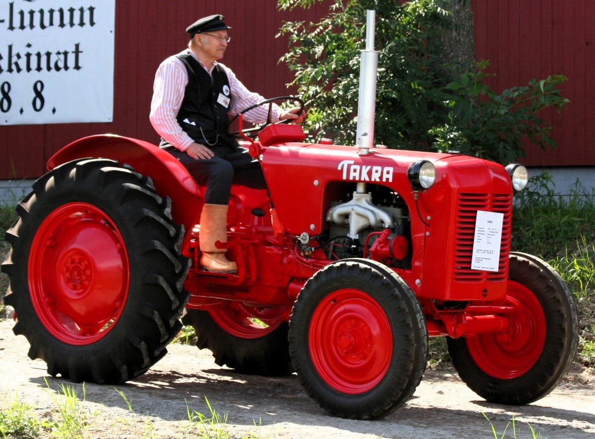 Huolella entisöity Takra Sirpistä puimuriin -tapahtumassa. Asiansa osaavana kuljettajana Matti Jaskari. Takraa valmistettiin 1949-54 vajaa 800 kappaletta.