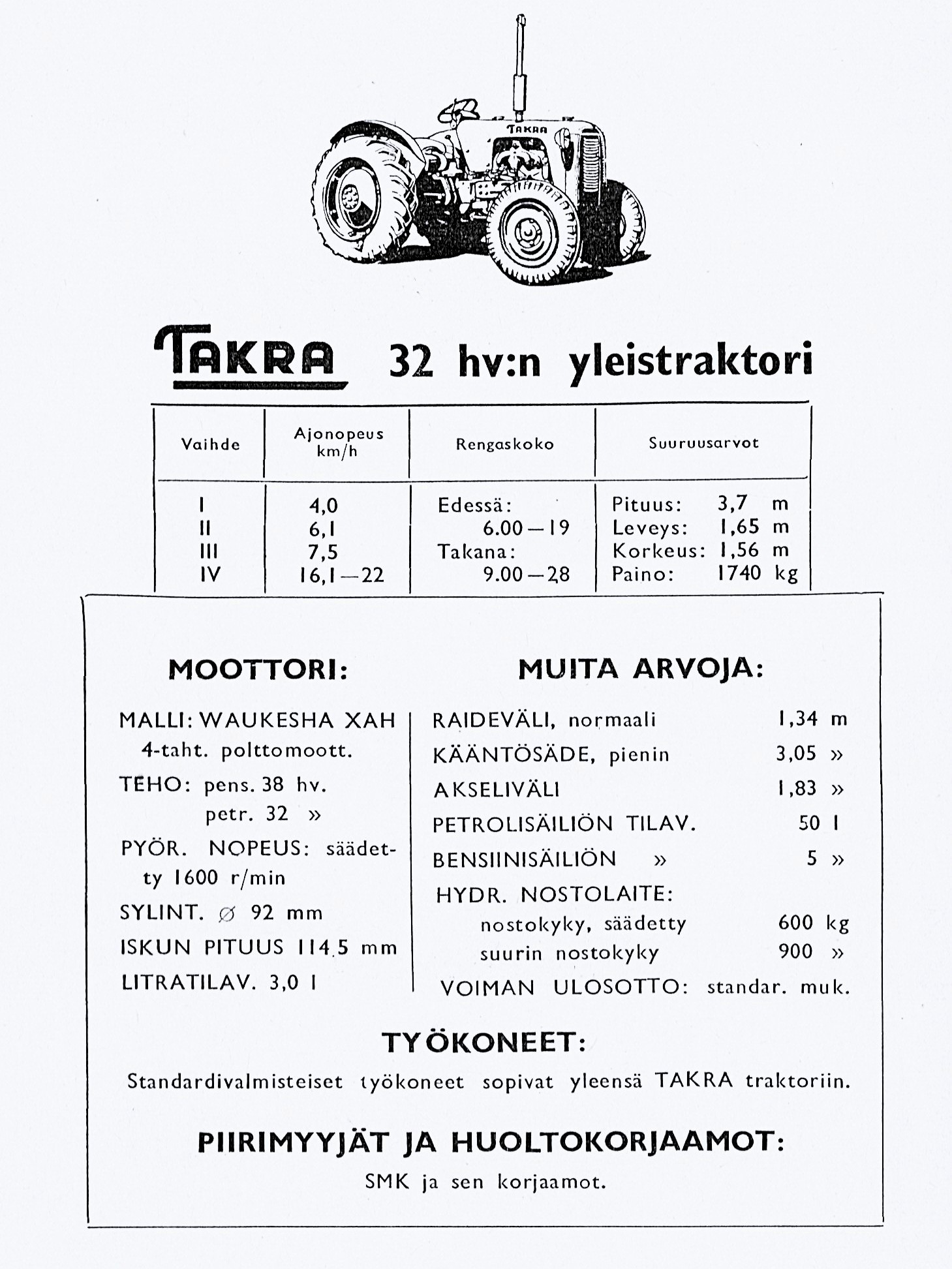 Takran tekniset tiedot kansakoulun oppimäärän mukaan. Tamperelaistraktori maksoi noin 650 000 mk. Vertailun vuoksi kerrottakoon, että esimerkiksi Fordson Majorin bensiini-petroli -versio maksoi 378 00 mk ja diesel-Nuffieldin hintalappuun oli printattu 518 000 mk. Viimeksimainittujen heikko puoli oli se, että niitä piti jonottaa pitkään