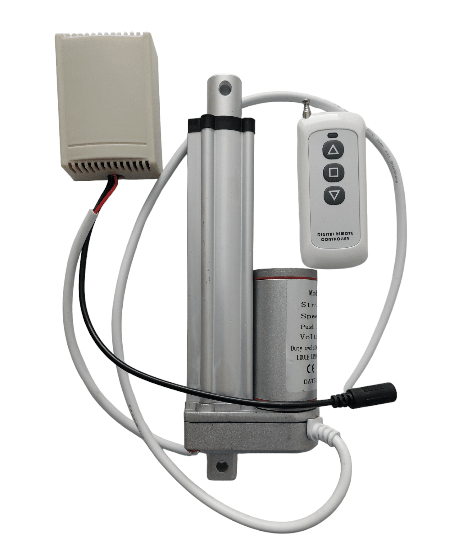 Lineaarimoottori kauko-ohjattaus, 12 V/220V, 100 mm työntövarsi, rungon pituus/ kiinnityspisteiden väli tanko sisällä on noin 155 mm, tanko ulkona 255 mm, työntö-/vetovoima 1300N noin 130 kg, nopeus 7 mm/s. Lineaarimoottori on roiskevesitiivis IP54.