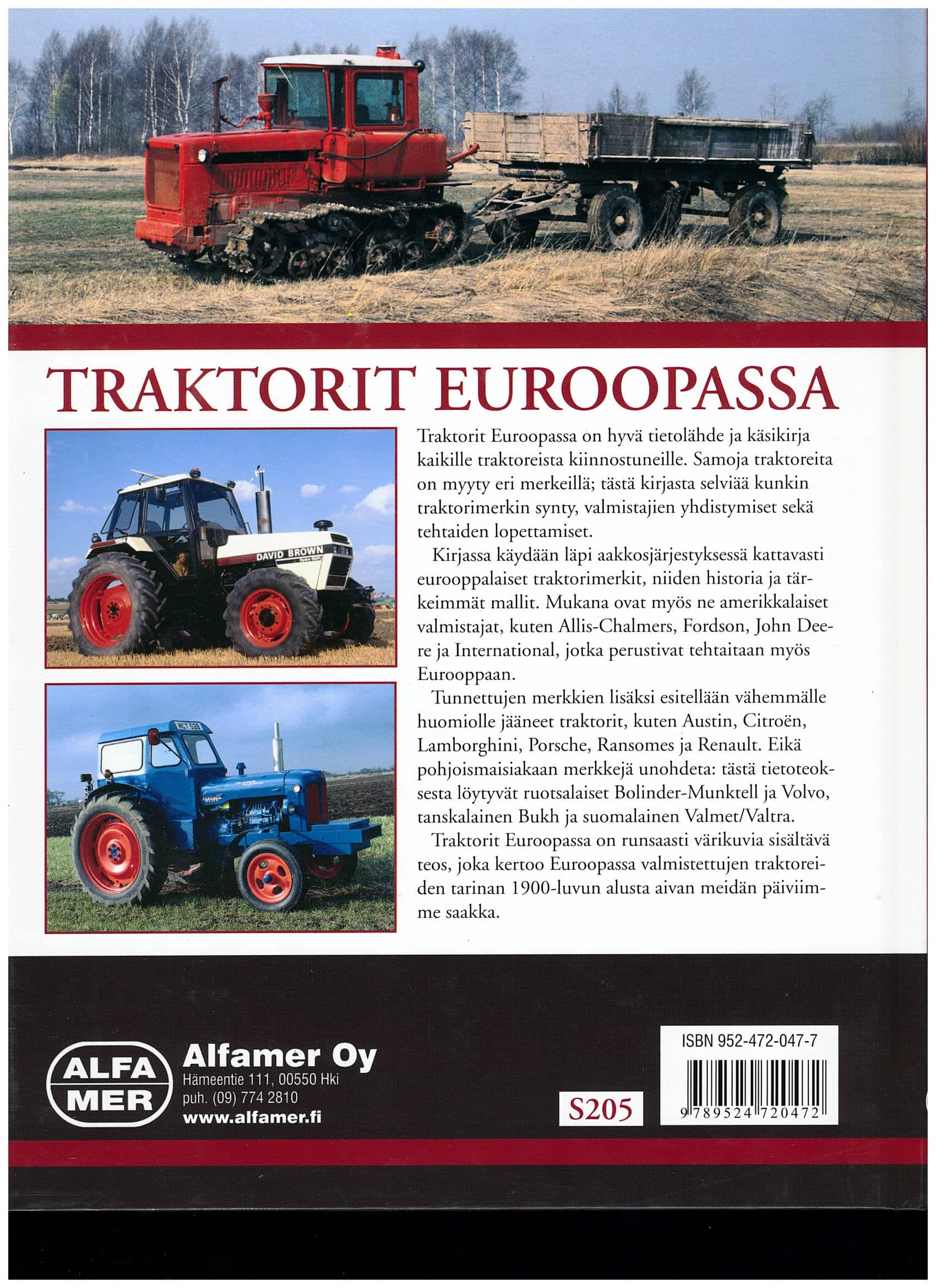 Traktorit Euroopassa; Alfamer -kirja ALFAMER on Suomen johtava auto- ja moottorikirjallisuuden kustantaja. Alfamer on julkaissut yli 40 vuoden aikana satoja kirjoja: korjausoppaita, tekniikka- ja historiakirjoja aiheina autot, traktorit, työkoneet, rakentaminen, ym.